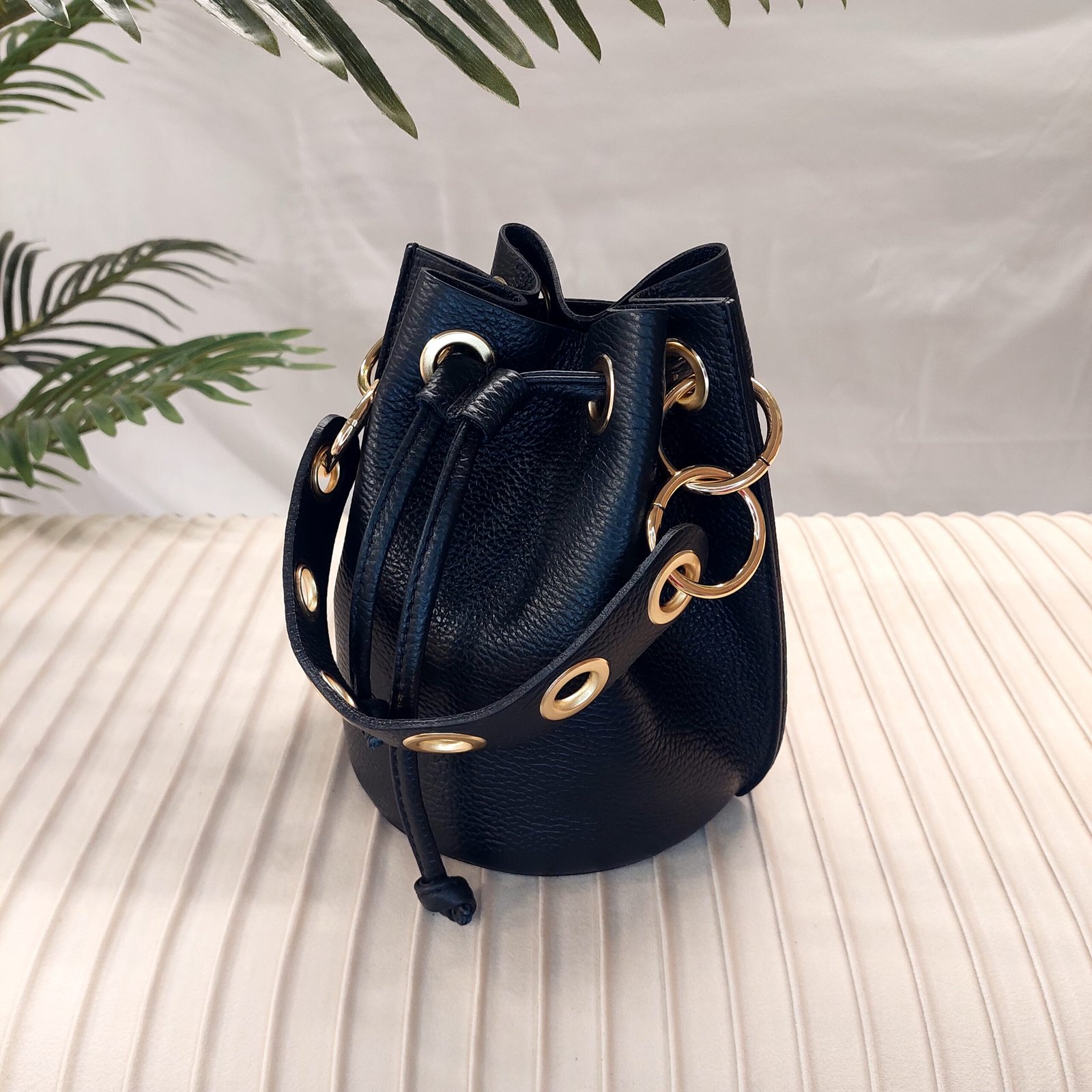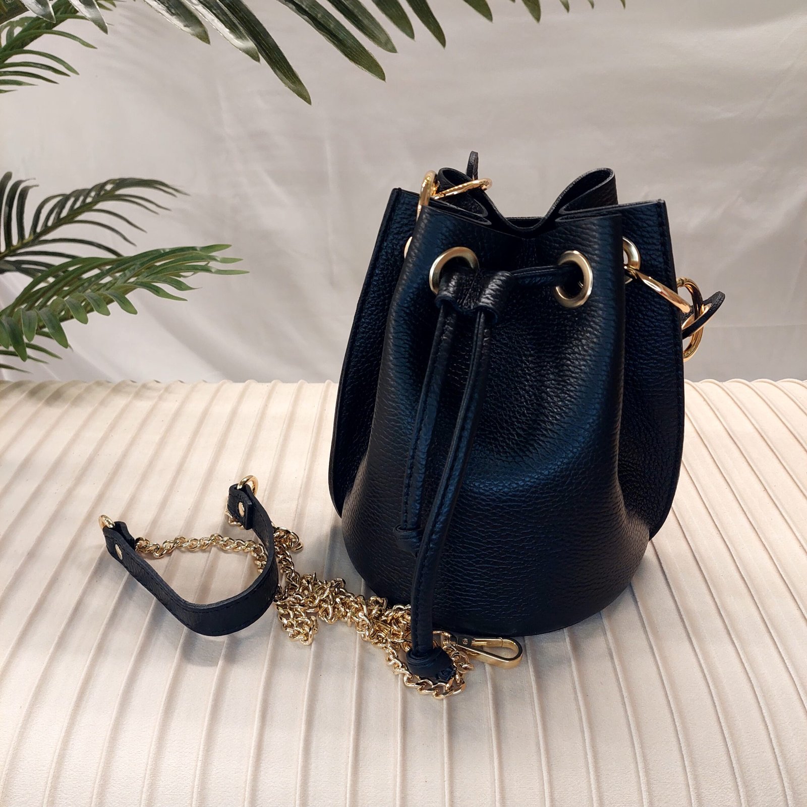 This small bucket bag with a front drawstring closure is perfect for any occasion! Featuring a single compartment, it’s ideal for carrying just the essentials. The decorative leather handle and gold-tone rings add a touch of class to your style. It also features two shoulder straps, one adjustable in leather and one in chain, for comfortable carrying.