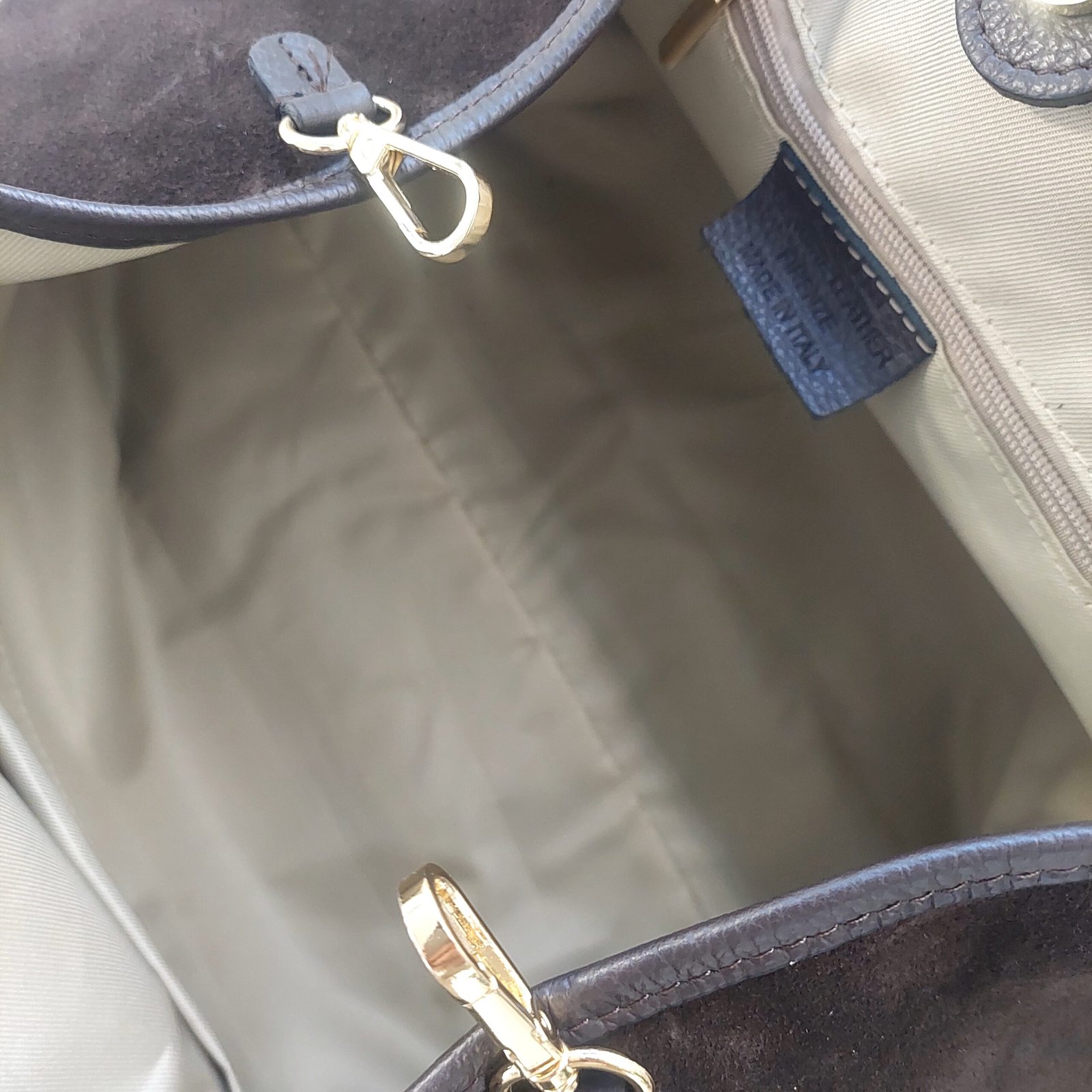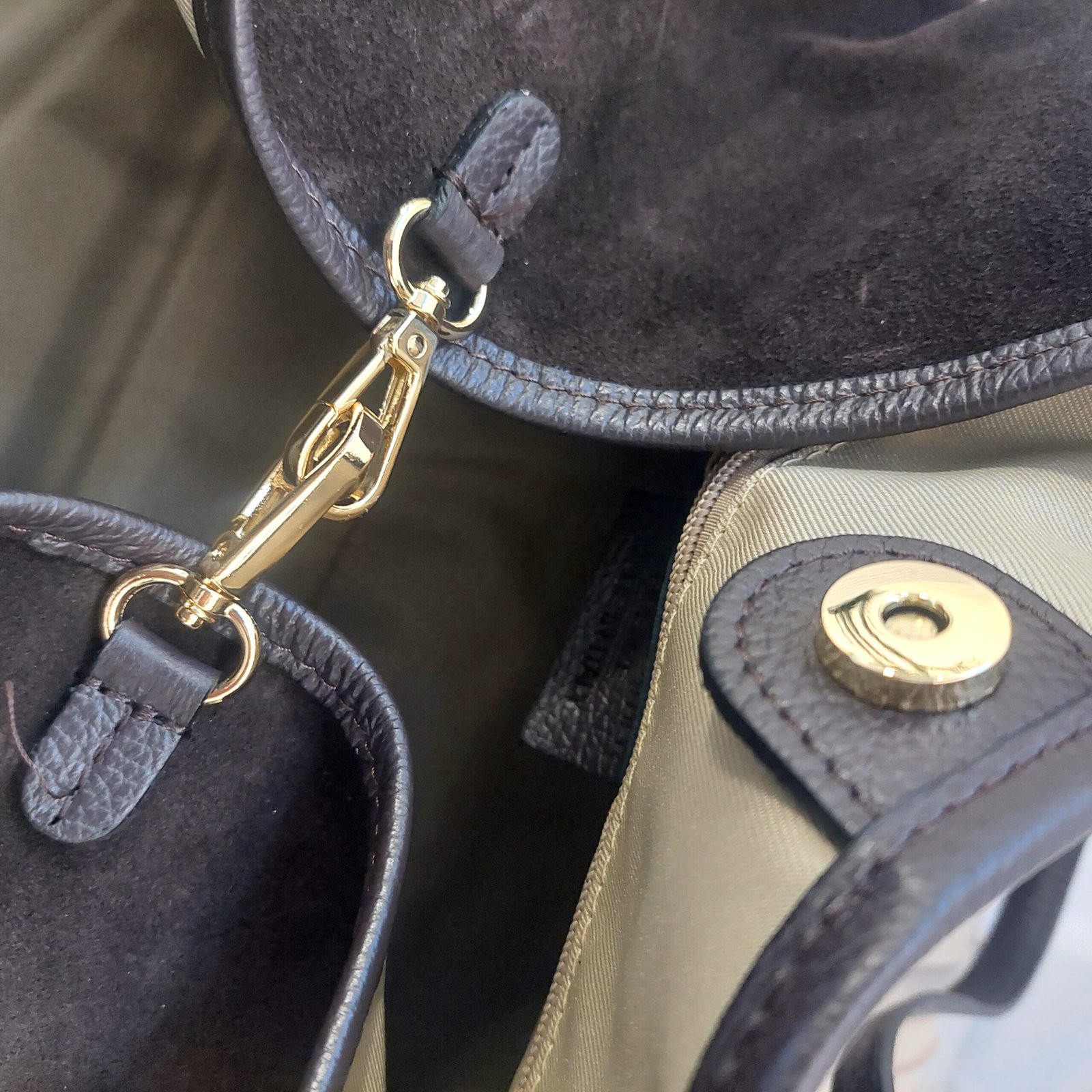 Maxi bag in contrasting suede and leather! A unique piece with a stylish design, it features a large compartment and four handles for easy portability. Inside, you’ll find a small zip pocket for your most valuable items and an external front pocket. It closes with a super practical snap hook and a central magnetic clip.