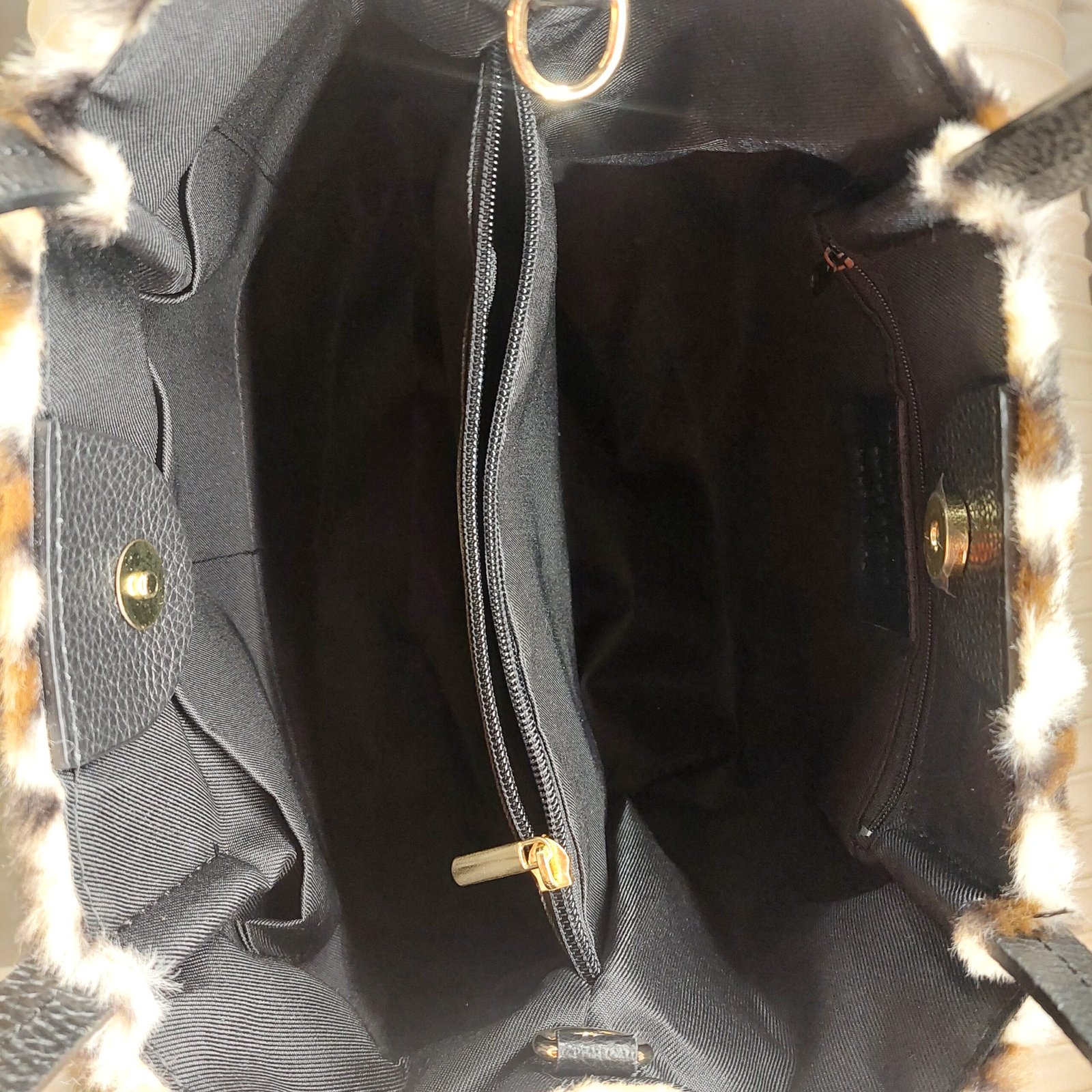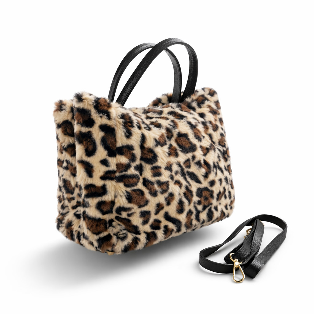 Borsa in ecopelliccia maculata, perfetta per chi cerca stile e funzionalitร . I manici resistenti e la tracolla regolabile in pelle offrono versatilitร  e comfort durante l’uso quotidiano. All’interno, il divisorio centrale con zip mantiene i tuoi oggetti ben organizzati, mentre la chiusura con clip magnetica garantisce praticitร .