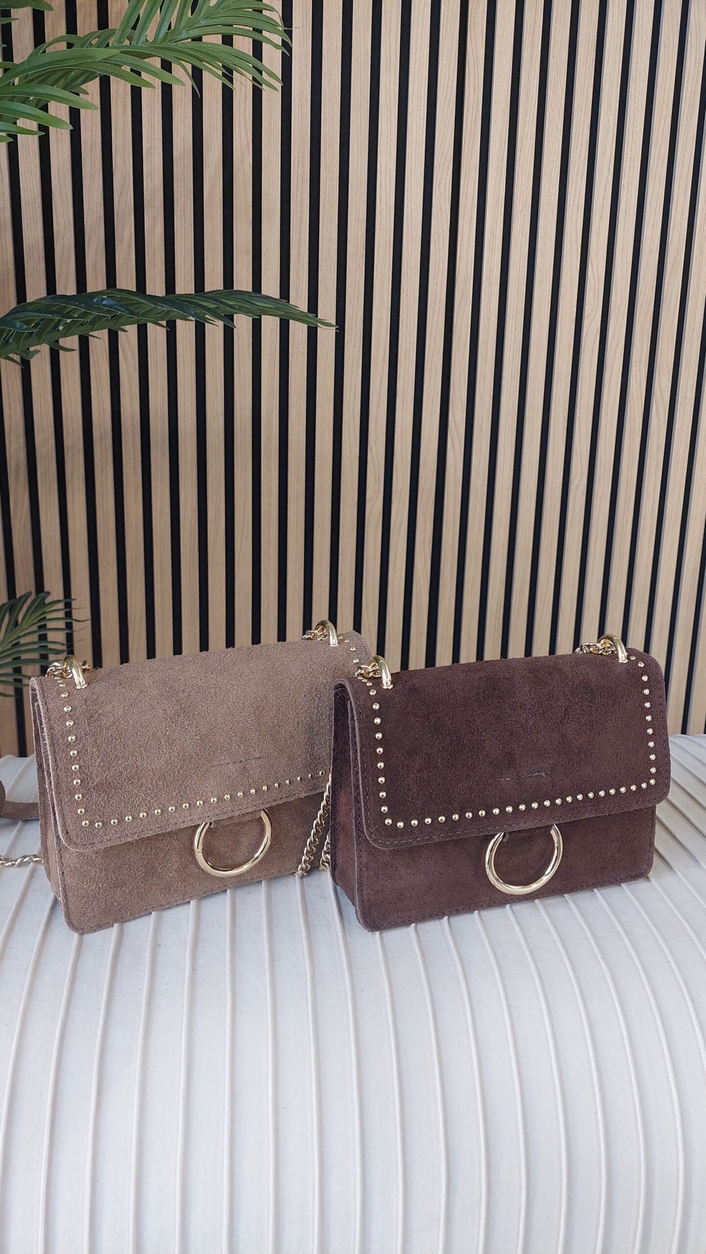 Borsa rigida in camoscio, รจ un accessorio elegante e versatile per ogni occasione.ย Caratterizzata da piccole borchie color oro sul davanti, questa borsa aggiunge un tocco di glamour al tuo look.ย La chiusura a clip garantisce sicurezza e praticitร , mentre il raffinato accessorio dorato completa il design con stile.ย La tracolla regolabile in catena offre una grande versatilitร , permettendoti di indossarla comodamente anche in movimento. 9Perfetta per serate speciali o per un giorno in cittร .
