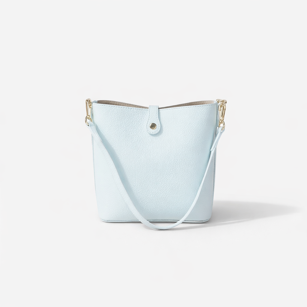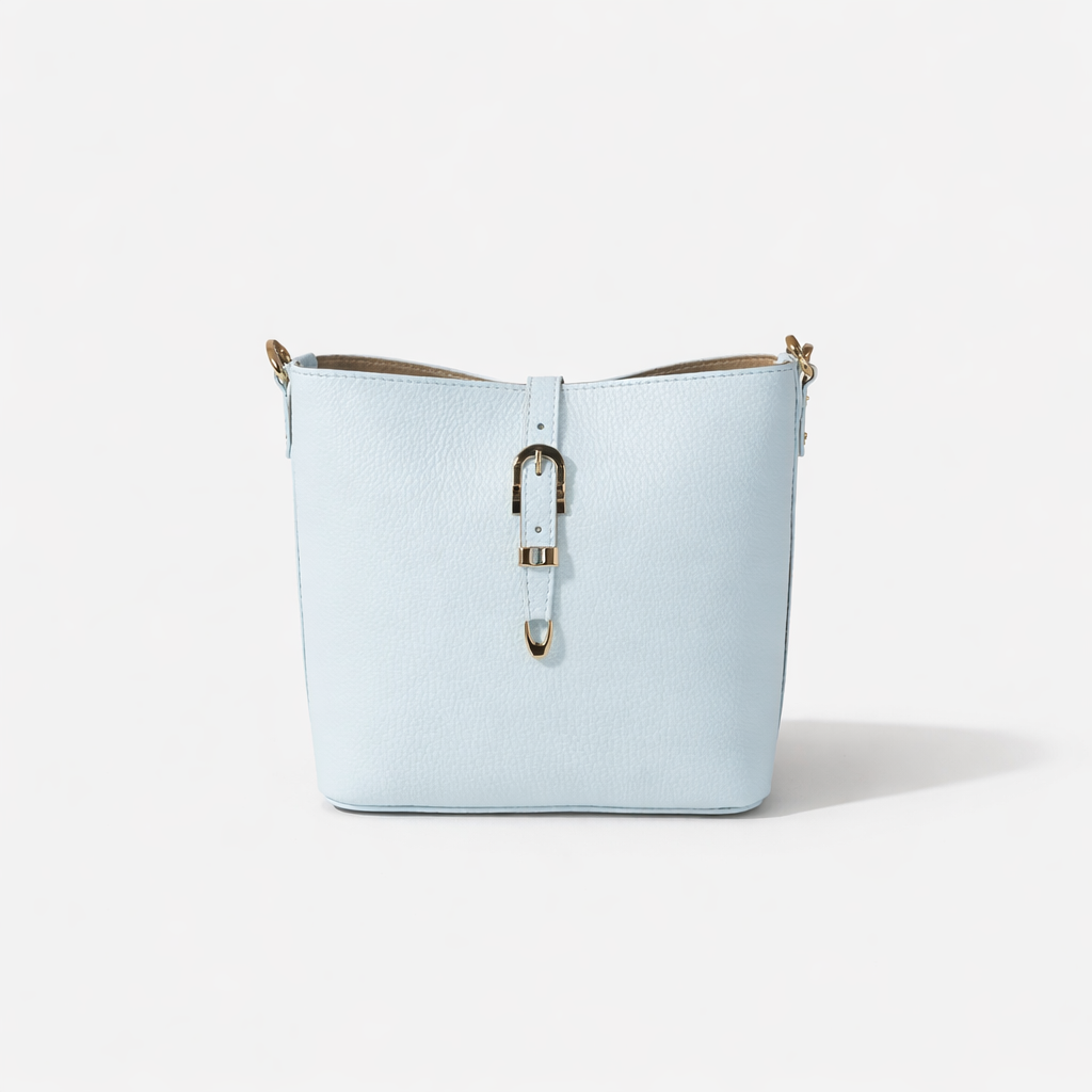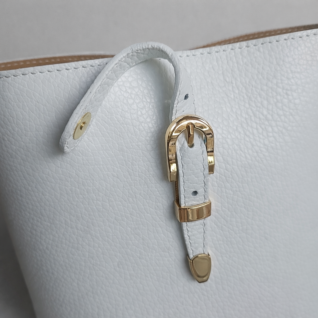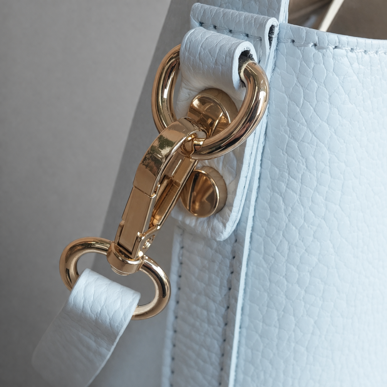 Il design minimal รจ impreziosito da una chiusura frontale con fibbia dorata e bottone a clip che aggiunge un dettaglio luminoso e sofisticato. La forma leggermente strutturata garantisce capienza senza rinunciare allo stile.