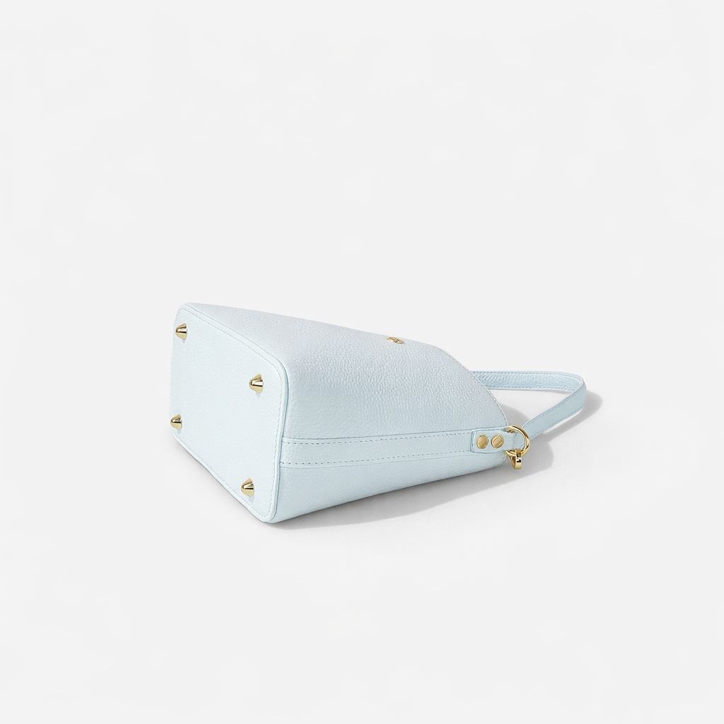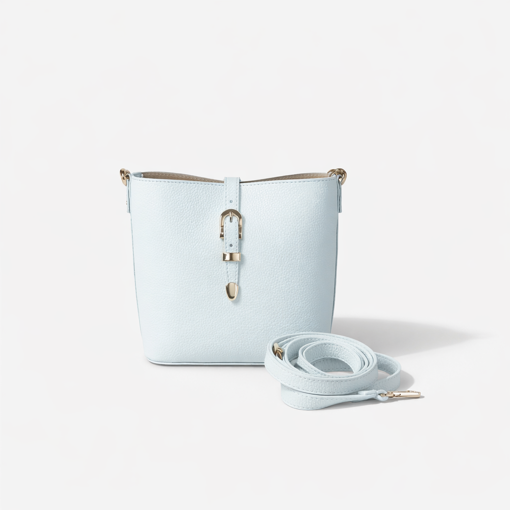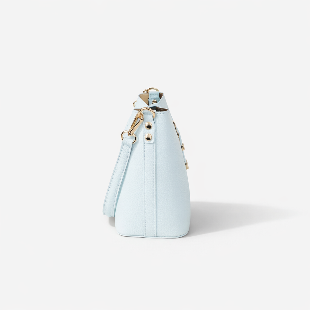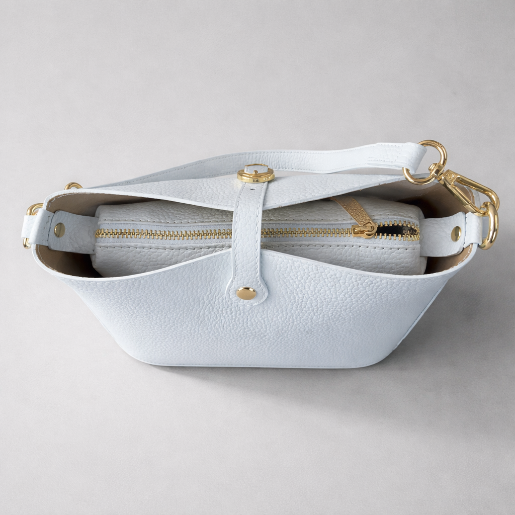 Il design minimal รจ impreziosito da una chiusura frontale con fibbia dorata e bottone a clip che aggiunge un dettaglio luminoso e sofisticato. La forma leggermente strutturata garantisce capienza senza rinunciare allo stile.