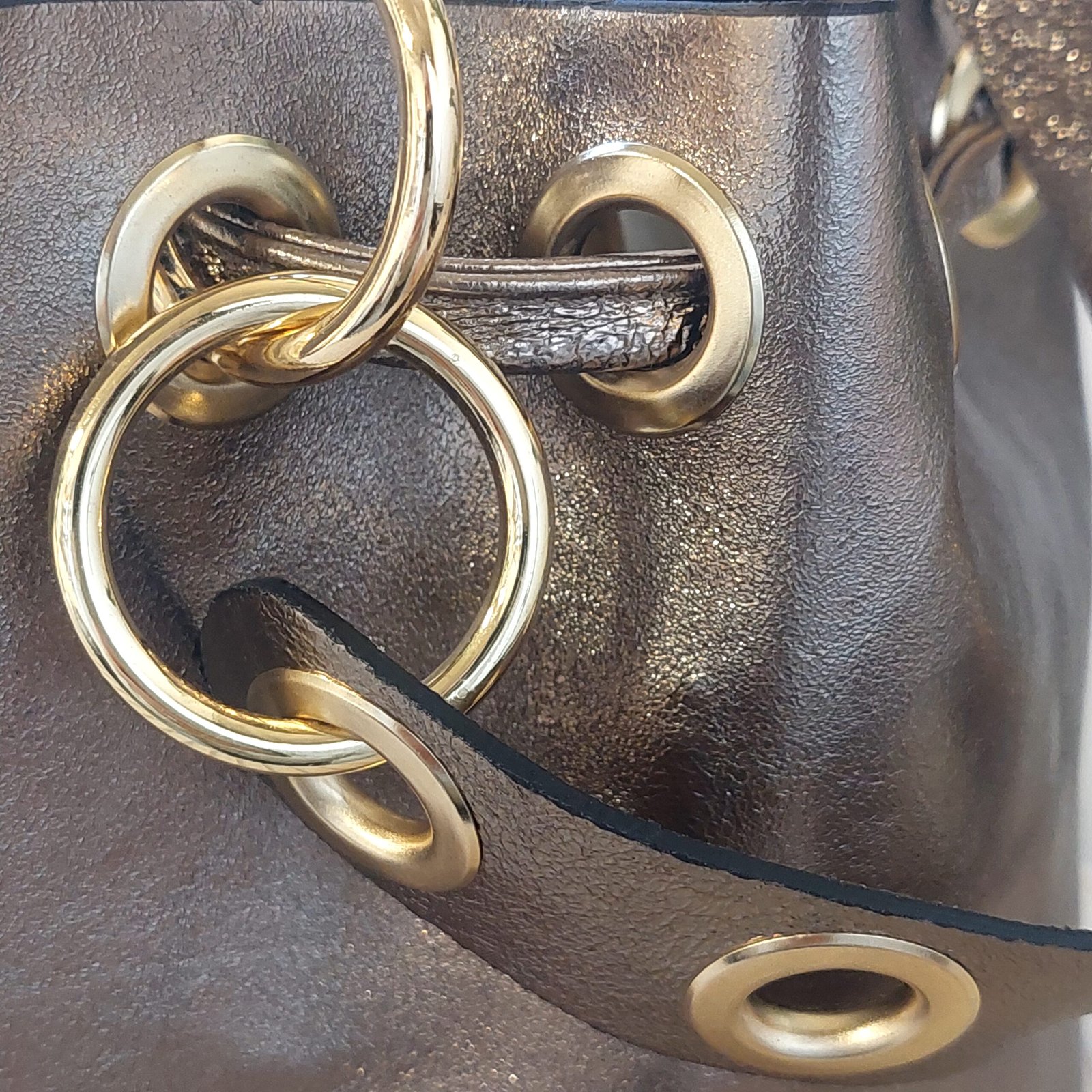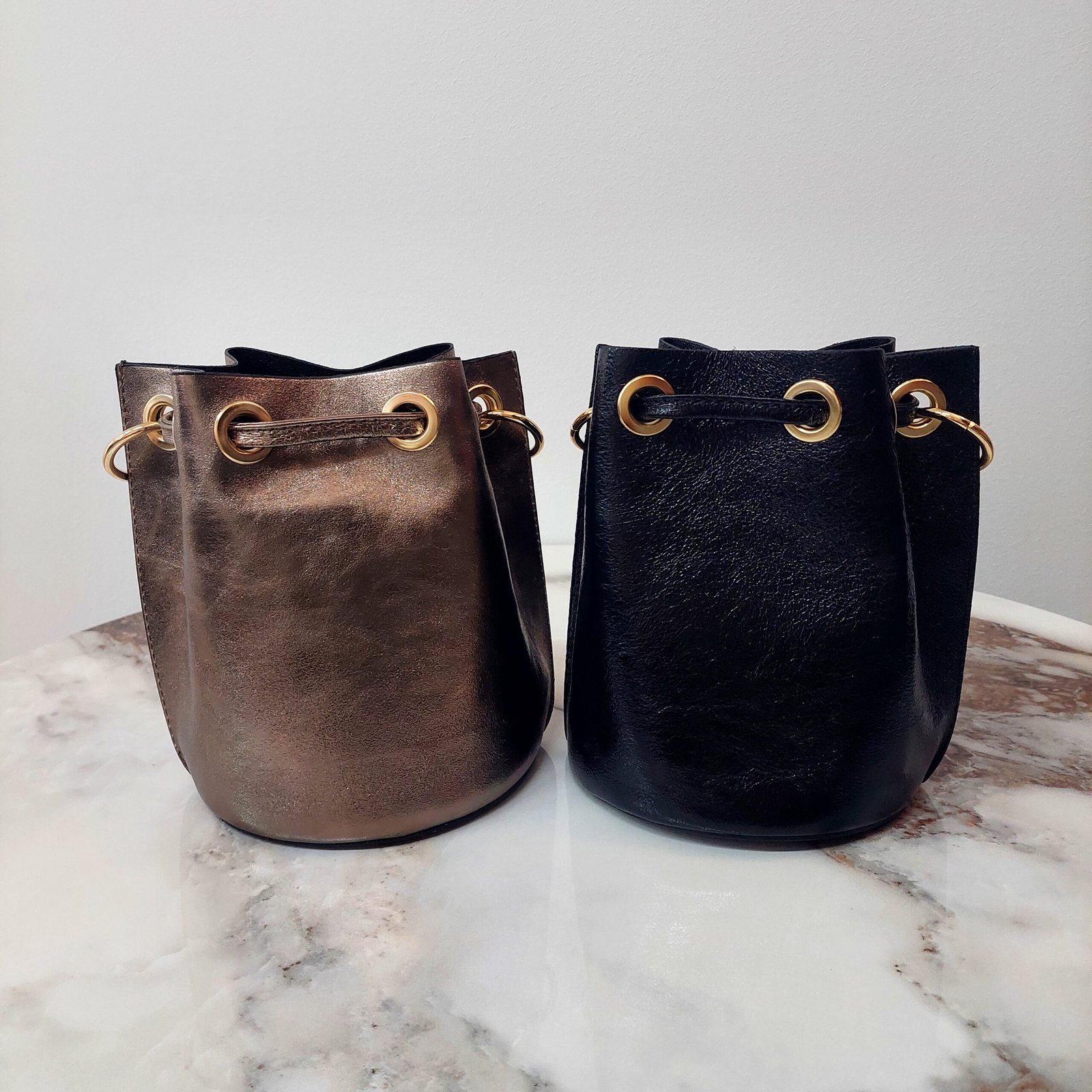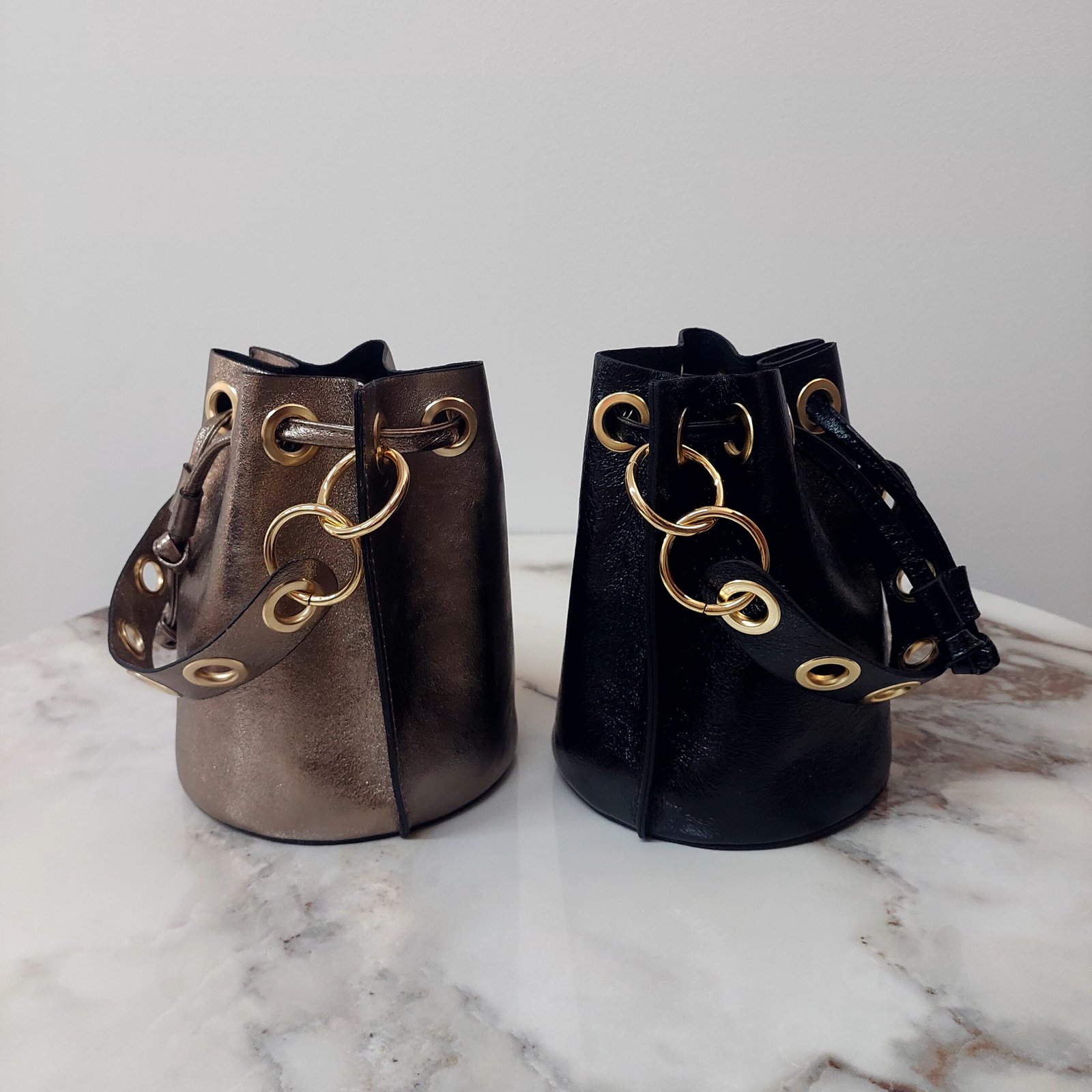 Piccolo secchiello con chiusura a laccio sul davanti, perfetto per ogni occasione! Con un unico scomparto, รจ ideale per portare con te solo lโ€™essenziale. Il manico decorato in pelle e gli anelli color oro aggiungono un tocco di classe al tuo stile.