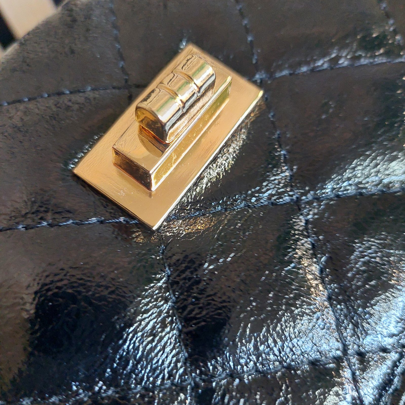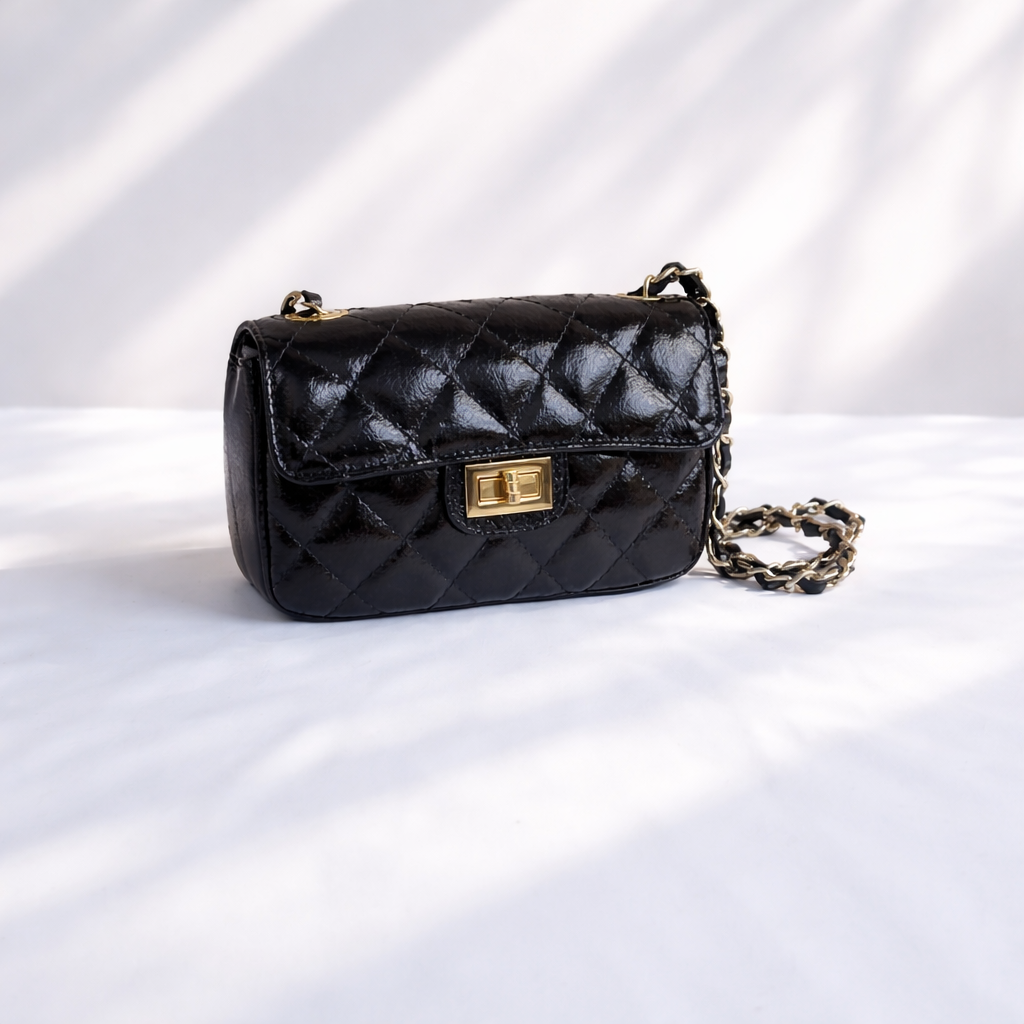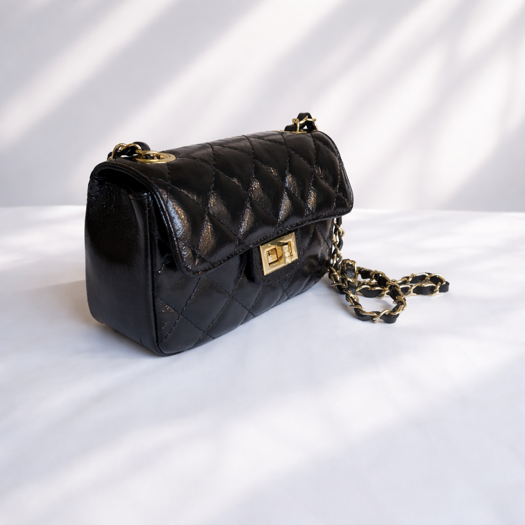 Borsa a tracolla piccola e strutturata, in pelle nera lucida con lavorazione trapuntata a rombi. Ha una patta frontale con chiusura metallica dorata e una tracolla a catena intrecciata con inserto nero. Elegante, compatta e adatta sia a look casual che piรน raffinati.