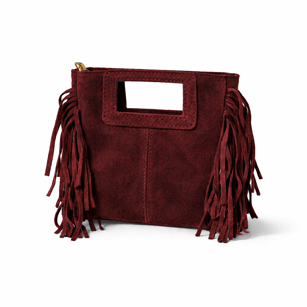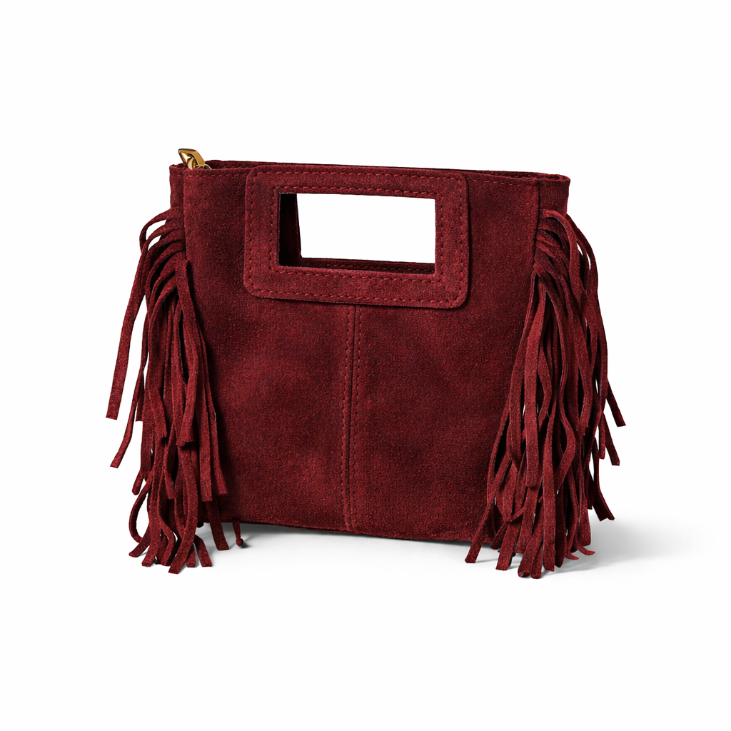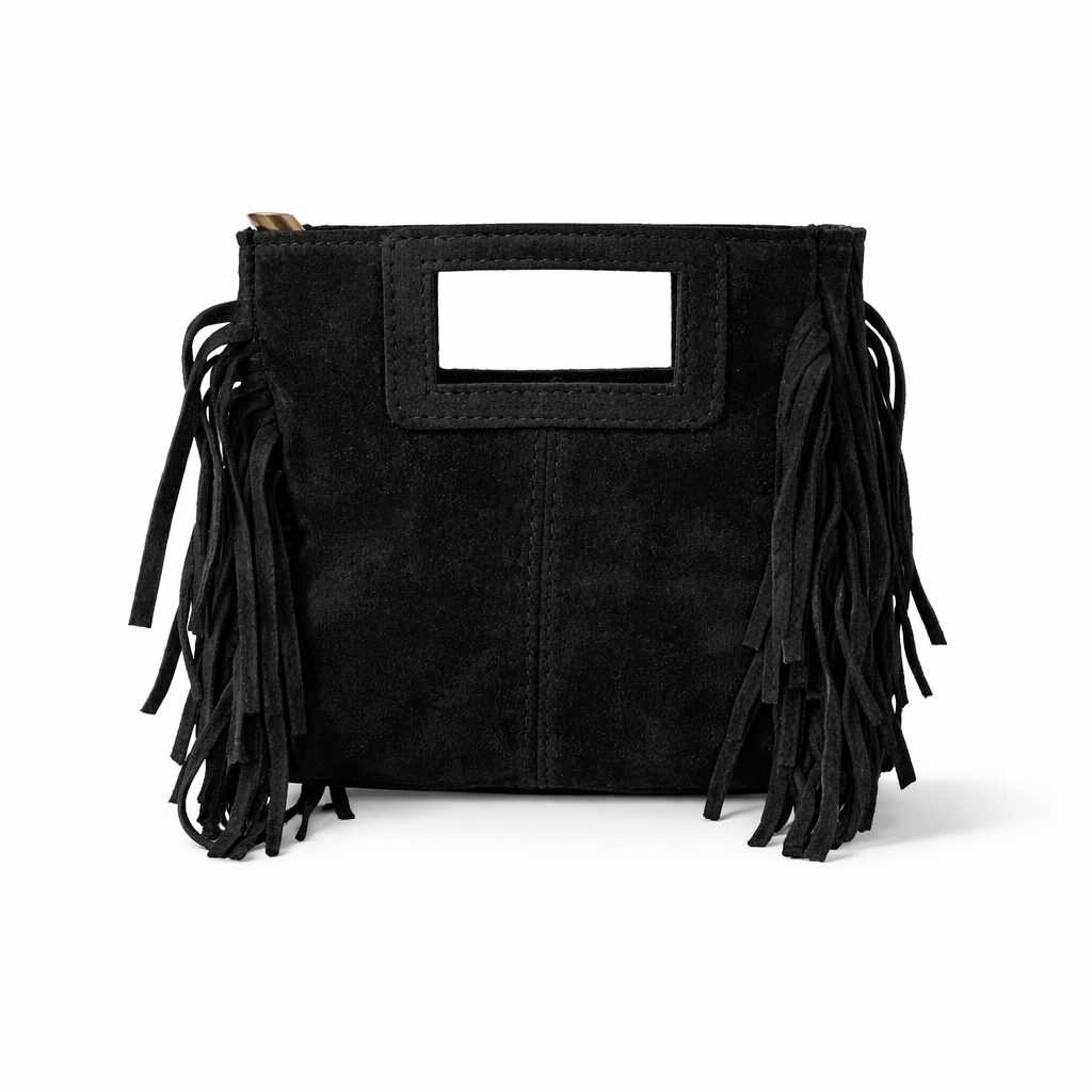 Mini borsa a mano in camoscio con frange sui lati, questo piccolo gioiello si adatta facilmente ai tuoi outfit casual di tutti i giorni, ma aggiunge anche un tocco country al tuo stile. Grazie alla tracolla regolabile all’interno, puoi portarla comodamente ovunque tu vada.